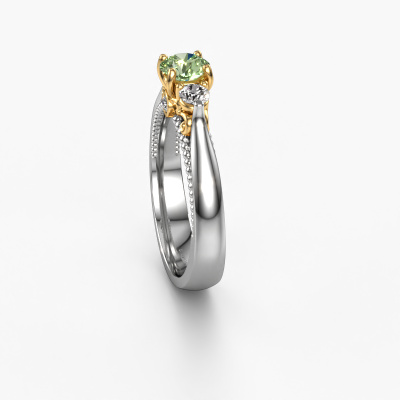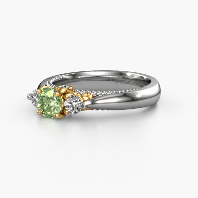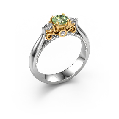 This 14 Carat white gold ring is called Tiffani and is set with 5 mm green lab grown diamond. This exclusive white gold 3-stone engagement ring is a true work of art! The ornaments are crafted with a lot of patience and great passion. In order to create this ring with great precision, this craft requires a keen eye and skillful hand. A challenge which ignites a fire in our expert goldsmith. The exquisite green lab grown diamondd are set in a special way so they stand out even more. This gives the ring an even more glamorous appearance. The ajour engagement ring is actually unique on its own because of the gemstones which we carefully select especially for this ring. On top of that you select the precious metals which will be used to create a unique ring for the most extraordinary woman in your life! This jewel is made just for you by our master goldsmiths in our own studio.After receiving your order, our goldsmiths will passionately start the creative process of making your engagement ring in our own studio. Because we don't have a big stockpile, these costs will not be passed on to you. Our pricing is proof of that! We offer top quality jewels at lowest price, guaranteed.Have you found a specific engagement ring somewhere which you would like to give to your loved one? Please feel free to express your wishes to our jewel designers because we would be honored to turn your design into a unique engagement ring. You can follow the development of your ring design because we use 3D drawings. This gives you a realistic preview of how your design will look. You can also preorder a dummy. A dummy is a plastic ring, which can be shaped according your ring design. You can try it on and check if its width and size are suitable for you. We will gladly send you a non-binding offer, based on a fair price/ quality ratio. It will amaze you, considering the quality of the ring and gemstones.To make it easier for you, we offer a 30 day return policy. Check our terms and conditions.