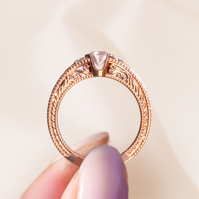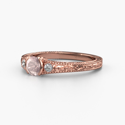 This 14 Carat rose gold ring is called Anamaria and is set with 5 mm morganite champagne. An extraordinary rose gold vintage ring. One that will surely make the love of your life shine like a diamond! That is what we hope to achieve. This vintage engagement ring is set with exquisite morganite champagne. Whichever gemstone you choose from our selection, is up to you. The gemstone is selected with great care because we believe your filigree engagement ring must be adorned with nothing but the most beautiful gemstone. Wouldn't you agree? Our expert goldsmith will design your ring in our own crafting studio, where the morganite champagne will be set with great precision. The ring will then be polished till it shines perfectly. Nothing but the best for the love of your life! This jewel is made just for you by our master goldsmiths in our own studio.Are you on a budget? Please feel free to contact us, so we can go discuss your options. We offer our engagement rings at guaranteed best price, because we make them to order. You won't find such a price anywhere else!Our team adds new designs to our online collection daily. Our designers and goldsmiths work together in creating the best design. We strive to offer a diverse collection of jewels. Perhaps you have a specific jewel design in mind. One you came across somewhere. Please contact us for a free consultation. We will make you an offer, based on a fair price/ quality ratio, that will baffle you.To make it easier for you, we offer a 30 day return policy. Check our terms and conditions.