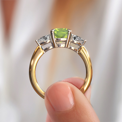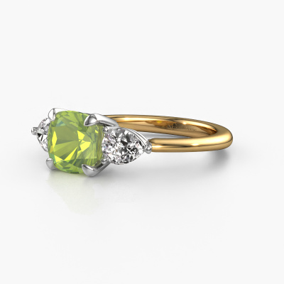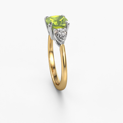 This 14 Carat gold ring is called Chanou CUS and is set with 7 mm peridot. This exclusive gold 3-stone engagement ring is a true work of art! The ornaments are crafted with a lot of patience and great passion. In order to create this ring with great precision, this craft requires a keen eye and skillful hand. A challenge which ignites a fire in our expert goldsmith. The exquisite peridot are set in a special way so they stand out even more. This gives the ring an even more glamorous appearance. The pretty engagement ring is actually unique on its own because of the gemstones which we carefully select especially for this ring. On top of that you select the precious metals which will be used to create a unique ring for the most extraordinary woman in your life! This jewel is made to shine bright around your finger. Each jewel is hand made with love by our goldsmiths.After receiving your order, our goldsmiths will start the creative process of making your Chanou CUS engagement ring. We don't keep stock. This is advantageous because these costs will not be passed on to you. Therefore, we can offer jewelry at exceptionally low prices.Our designers and goldsmiths work together each day, creating new jewels. Perhaps you have found a nice exclusive engagement ring somewhere, which can be used to customize your unique ring. Please feel free to contact us. We will make you an offer, based on a fair price/ quality ratio, which will amaze you.To make it easier for you, we offer a 30 day return policy. Check our terms and conditions.