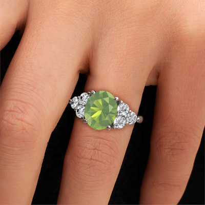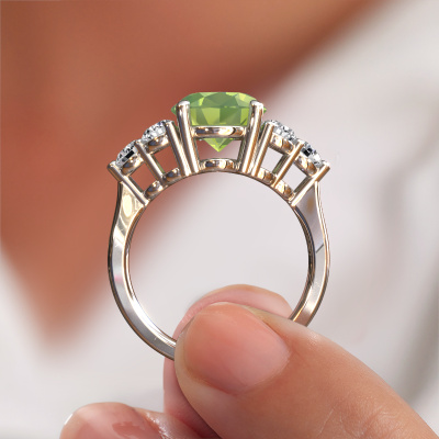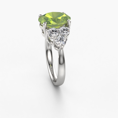 This platinum ring is called Serenity OVL and is set with 11x9 mm peridot. This exclusive platinum 3-stone engagement ring is a true work of art! The ornaments are crafted with a lot of patience and great passion. In order to create this ring with great precision, this craft requires a keen eye and skillful hand. A challenge which ignites a fire in our expert goldsmith. The exquisite peridot are set in a special way so they stand out even more. This gives the ring an even more glamorous appearance. The sublime engagement ring is actually unique on its own because of the gemstones which we carefully select especially for this ring. On top of that you select the precious metals which will be used to create a unique ring for the most extraordinary woman in your life! This jewel is made just for you by our master goldsmiths in our own studio.By using a combination of the latest modern techniques, combined with ancient crafting, we can make all our engagement rings in our own studio. Each jewel is made to order. This is advantageous because we can offer you a price you won't find anywhere else.Different styles of new rings are made daily by our team. Perhaps you have found a 3-stone engagement ring somewhere. One you would like to give to your loved one. Please feel free to share your thoughts and design with our jewel designers. We would love to turn your design into a exclusive engagement ring. You can follow the development of your ring design because we use very detailed 3D drawings. On top of that, you can order a dummy of the design. A dummy is a plastic ring, which can be shaped according your ring design. You can try it on and check if the engagement ring is up to standard. We will gladly send you a non-binding offer, based on a fair price/ quality ratio. The offer will baffle you, considering the quality of the ring and gemstones.To make it easier for you, we offer a 30 day return policy. Check our terms and conditions.