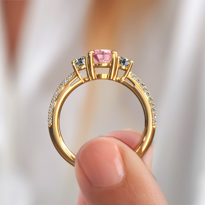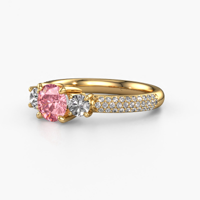 This 14 Carat gold ring is called Marielle RND and is set with 6 mm pink lab grown diamond. This exclusive gold 3-stone engagement ring is a true work of art! The ornaments are crafted with a lot of patience and great passion. In order to create this ring with great precision, this craft requires a keen eye and skillful hand. A challenge which ignites a fire in our expert goldsmith. The exquisite pink lab grown diamonds are set in a special way so they stand out even more. This gives the ring an even more glamorous appearance. The tasteful engagement ring is actually unique on its own because of the gemstones which we carefully select especially for this ring. On top of that you select the precious metals which will be used to create a unique ring for the most extraordinary woman in your life! This jewel is made with passion and love by one of our master goldsmiths.By using a combination of the latest modern techniques, combined with ancient crafting, we can make all our engagement rings in our own studio. Each jewel is made to order. This is advantageous because we can offer you a price you won't find anywhere else.Our designers and goldsmiths work together each day, creating new jewels. Perhaps you have found a nice exclusive engagement ring somewhere, which can be used to customize your unique ring. Please feel free to contact us. We will make you an offer, based on a fair price/ quality ratio, which will amaze you.To make it easier for you, we offer a 30 day return policy. Check our terms and conditions.