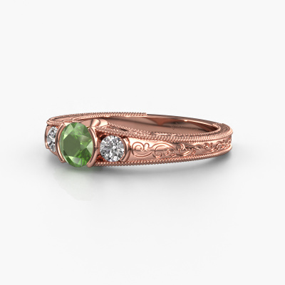 This 14 Carat rose gold ring is called Tasia and is set with 5 mm tourmaline green. Is your girlfriend hooked on vintage? Then this rose gold filigree promise ring will surely match her style perfectly. A trendy ring with just a hint of vintage adornment. A truly stunning, romantic design! Especially when you customize your ring to your own liking. This vintage 3-stone promise ring is set with stunning tourmaline green. As you can see, you are the boss in selecting a gemstone which matches the style of your girlfriend best. Each gemstone is carefully selected by our merchants whom are spread throughout the world. Nothing but the best gems for our expert goldsmith. After all, it is his crowning glory! Each jewel is made with passion and love by one of our master goldsmiths.By using a combination of the latest modern techniques, combined with ancient crafting, we can make all our promise ring in our own studio. Each jewel is made to order. This is advantageous because we can offer you a price you won't find anywhere else.Our team adds new designs to our online collection daily. Our designers and goldsmiths work together in creating the best design. We strive to offer a diverse collection of jewels. Perhaps you have a specific jewel design in mind. One you came across somewhere. Please contact us for a free consultation. We will make you an offer, based on a fair price/ quality ratio, that will baffle you.To make it easier for you, we offer a 30 day return policy. Check our terms and conditions.