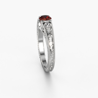 This 14 Carat white gold ring is called Tasia and is set with 5 mm garnet. Is your girlfriend hooked on vintage? Then this white gold filigree promise ring will surely match her style perfectly. A trendy ring with just a hint of vintage adornment. A truly stunning, romantic design! Especially when you customize your ring to your own liking. This vintage 3-stone promise ring is set with stunning garnet. As you can see, you are the boss in selecting a gemstone which matches the style of your girlfriend best. Each gemstone is carefully selected by our merchants whom are spread throughout the world. Nothing but the best gems for our expert goldsmith. After all, it is his crowning glory! Each jewel is made with passion and love by one of our master goldsmiths.By using a combination of the latest modern techniques, combined with ancient crafting, we can make all our promise ring in our own studio. Each jewel is made to order. This is advantageous because we can offer you a price you won't find anywhere else.Our team adds new designs to our online collection daily. Our designers and goldsmiths work together in creating the best design. We strive to offer a diverse collection of jewels. Perhaps you have a specific jewel design in mind. One you came across somewhere. Please contact us for a free consultation. We will make you an offer, based on a fair price/ quality ratio, that will baffle you.To make it easier for you, we offer a 30 day return policy. Check our terms and conditions.