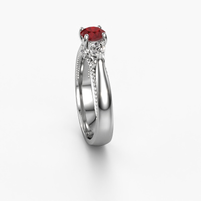 This platinum ring is called Tiffani and is set with 5 mm ruby. This exclusive platinum 3-stone engagement ring is a true work of art! The ornaments are crafted with a lot of patience and great passion. In order to create this ring with great precision, this craft requires a keen eye and skillful hand. A challenge which ignites a fire in our expert goldsmith. The exquisite ruby are set in a special way so they stand out even more. This gives the ring an even more glamorous appearance. The ajour engagement ring is actually unique on its own because of the gemstones which we carefully select especially for this ring. On top of that you select the precious metals which will be used to create a unique ring for the most extraordinary woman in your life! This jewel is made just for you by our master goldsmiths in our own studio.After receiving your order, our goldsmiths will passionately start the creative process of making your engagement ring in our own studio. Because we don't have a big stockpile, these costs will not be passed on to you. Our pricing is proof of that! We offer top quality jewels at lowest price, guaranteed.Have you found a specific engagement ring somewhere which you would like to give to your loved one? Please feel free to express your wishes to our jewel designers because we would be honored to turn your design into a unique engagement ring. You can follow the development of your ring design because we use 3D drawings. This gives you a realistic preview of how your design will look. You can also preorder a dummy. A dummy is a plastic ring, which can be shaped according your ring design. You can try it on and check if its width and size are suitable for you. We will gladly send you a non-binding offer, based on a fair price/ quality ratio. It will amaze you, considering the quality of the ring and gemstones.To make it easier for you, we offer a 30 day return policy. Check our terms and conditions.