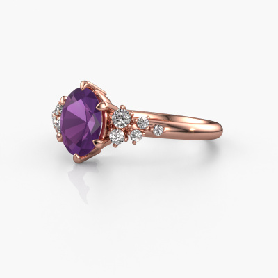 The ring shown above is called the Royce OVL. We call this type of ring a pavé solitaire ring because it has one center gemstone and a band that is also pave set with gemstones. This engagement ring is made in 14 Carat rose gold set with a 8x6 mm oval amethyst, and pave set lab grown diamonds at the sides. Each piece of jewelry is made with passion and love by one of our master goldsmiths.This fantasy rose gold pavé solitaire engagement ring has an exquisite oval amethyst center stone. To further accentuate the center stone, the band is set full with more lab grown diamonds. Its open prong setting allows light to strike the amethyst from various angles and this adds sparkle to your amethyst ring. The photo shown above depicts the goldsmith's carefully handcrafted details of the ring. The high positioning of the center stone is truly eye-catching. The perfect engagement ring for the crown jewel of your life!After receiving your order, our goldsmiths will passionately start the creative process of making your engagement ring in our own studio. Because we don't have a big stockpile, these costs will not be passed on to you. Our pricing is proof of that! We offer top quality jewels at lowest price, guaranteed.Have you found a specific engagement ring somewhere which you would like to give to your loved one? Please feel free to express your wishes to our jewel designers because we would be honored to turn your design into a fantasy engagement ring. You can follow the development of your ring design because we use 3D drawings. This gives you a realistic preview of how your design will look. You can also preorder a dummy. A dummy is a plastic ring, which can be shaped according your ring design. You can try it on and check if its width and size are suitable for you. We will gladly send you a non-binding offer, based on a fair price/ quality ratio. It will amaze you, considering the quality of the ring and gemstones.To make it easier for you, we offer a 30 day return policy. Check our terms and conditions.
