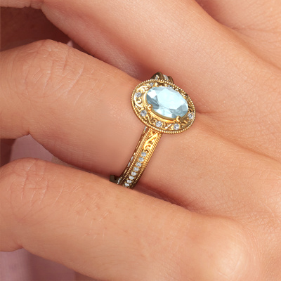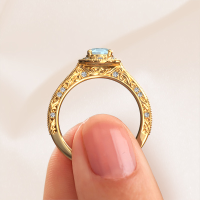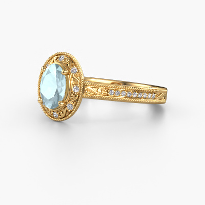 This 14 Carat gold ring is called Alice OVL and is set with 7x5 mm aquamarine. What is it that makes your relationship unique? What is it about her that makes you want to bend down on one knee? The unique bond between the two of you is emphasized by an equally unique ring. A one of a kind filigree halo engagement ring made especially for her. That is why this vintage ring fits her like a glove. Each specific detail of this filigree gold aquamarine set engagement ring is hand-picked, crafted and polished by our expert goldsmith. The result is an exquisite ring, unique and perfectly crafted to perfection. That is what our expert Goldsmiths strive for. This jewel is made with passion and love by one of our master goldsmiths.By using our modern techniques, we can design and customize the finest quality jewels with the utmost care for you. Our engagement rings are always priced 30 percent lower than other jewelers. We make engagement rings to order so we don't have to maintain a large stock. If you have a certain budget, we are more than happy to advice you accordingly.Our team adds new designs to our online collection daily. Our designers and goldsmiths work together in creating the best design. We strive to offer a diverse collection of jewels. Perhaps you have a specific jewel design in mind. One you came across somewhere. Please contact us for a free consultation. We will make you an offer, based on a fair price/ quality ratio, that will baffle you.To make it easier for you, we offer a 30 day return policy. Check our terms and conditions.