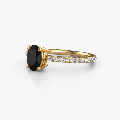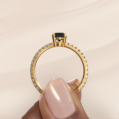 The ring shown above is called the Lynelle 2. We call this type of ring a pavé solitaire ring because it has one center gemstone and a band that is also pave set with gemstones. This engagement ring is made in 14 Carat gold set with a 1.05 crt oval black diamond, and pave set diamonds at the sides. Each piece of jewelry is created to add sparkle to your finger, each jewel is lovingly made by hand by our goldsmiths.This classic gold pavé solitaire engagement ring has an exquisite oval black diamond center stone. To further accentuate the center stone, the band is set full with more diamonds. Its open prong setting allows light to strike the black diamond from various angles and this adds sparkle to your black diamond ring. The photo shown above depicts the goldsmith's carefully handcrafted details of the ring. The high positioning of the center stone is truly eye-catching. The perfect engagement ring for the crown jewel of your life!After receiving your order, our goldsmiths will start the creative process of making your Lynelle 2 engagement ring. We don't keep stock. This is advantageous because these costs will not be passed on to you. Therefore, we can offer jewelry at exceptionally low prices.Do you have a specific ring in mind? One you came across somewhere. Please feel free to tell us your wishes and we will turn your design into a unique engagement ring. You can follow the development of your ring design because we use 3D drawings. This gives you a realistic preview of your design. We will gladly send you a non-binding offer, based on a fair price/ quality ratio. It will amaze you.To make it easier for you, we offer a 30 day return policy. Check our terms and conditions.