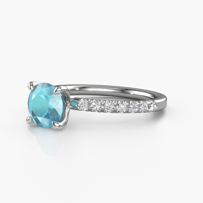 The ring shown above is called the Crystal RND 2. We call this type of ring a pavé solitaire ring because it has one center gemstone and a band that is also pave set with gemstones. The platinum engagement ring is set with a round 7 mm blue topaz center stone and the band is pave set with lab-grown diamond gemstones. Each jewel is unique in every way! Simply customize to your liking,This classic platinum pavé solitaire engagement ring has an exquisite round blue topaz center stone. To further accentuate the center stone, the band is fully set with more lab grown diamonds. Its open prong setting allows light to strike the blue topaz from various angles and this adds sparkle to your blue topaz ring. The photo shown above depicts the goldsmith's carefully handcrafted details of the ring. The high positioning of the center stone is truly eye-catching. The perfect engagement ring for the crown jewel of your life! After receiving your order, our goldsmiths will start the creative process of making your Crystal RND 2 engagement ring. We don't keep stock. This is advantageous because these costs will not be passed on to you. Therefore, we can offer jewelry at exceptionally low prices.Different styles of new rings are made daily by our team. Perhaps you have found a pavé solitaire engagement ring somewhere. One you would like to give to your loved one. Please feel free to share your thoughts and design with our jewel designers. We would love to turn your design into a classic engagement ring. You can follow the development of your ring design because we use very detailed 3D drawings. On top of that, you can order a dummy of the design. A dummy is a plastic ring, which can be shaped according your ring design. You can try it on and check if the engagement ring is up to standard. We will gladly send you a non-binding offer, based on a fair price/ quality ratio. The offer will baffle you, considering the quality of the ring and gemstones.To make it easier for you, we offer a 30 day return policy. Check our terms and conditions.