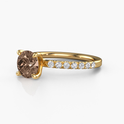 The ring shown above is called the Crystal RND 2. We call this type of ring a pavé solitaire ring because it has one center gemstone and a band that is also pave set with gemstones. The 14 Carat gold engagement ring is set with a round 1.30 crt brown diamond center stone and the band is pave set with lab-grown diamond gemstones. Each jewel is unique in every way! Simply customize to your liking,This classic gold pavé solitaire engagement ring has an exquisite round brown diamond center stone. To further accentuate the center stone, the band is fully set with more lab grown diamonds. Its open prong setting allows light to strike the brown diamond from various angles and this adds sparkle to your brown diamond ring. The photo shown above depicts the goldsmith's carefully handcrafted details of the ring. The high positioning of the center stone is truly eye-catching. The perfect engagement ring for the crown jewel of your life! After receiving your order, our goldsmiths will start the creative process of making your Crystal RND 2 engagement ring. We don't keep stock. This is advantageous because these costs will not be passed on to you. Therefore, we can offer jewelry at exceptionally low prices.Different styles of new rings are made daily by our team. Perhaps you have found a pavé solitaire engagement ring somewhere. One you would like to give to your loved one. Please feel free to share your thoughts and design with our jewel designers. We would love to turn your design into a classic engagement ring. You can follow the development of your ring design because we use very detailed 3D drawings. On top of that, you can order a dummy of the design. A dummy is a plastic ring, which can be shaped according your ring design. You can try it on and check if the engagement ring is up to standard. We will gladly send you a non-binding offer, based on a fair price/ quality ratio. The offer will baffle you, considering the quality of the ring and gemstones.To make it easier for you, we offer a 30 day return policy. Check our terms and conditions.