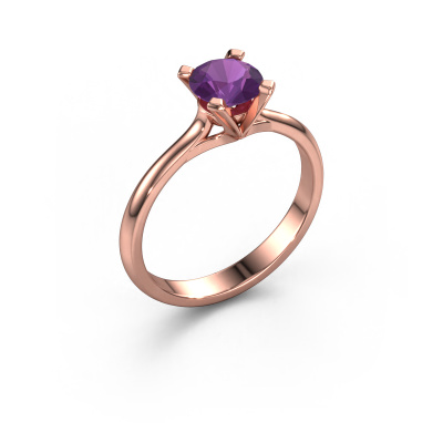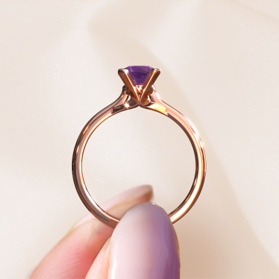 The ring shown above is called the Isa 1. We call this a solitaire ring because it contains a single gemstone. The engagement ring is made in 14 Carat rose gold and has a round amethyst of 5.7 mm. This extraordinary classic rose gold solitaire engagement ring is set with a beautiful round amethyst to add sparkle to your proposal. The open prong setting allows light to strike the gemstone from various angles. Did you know a diamond represents everlasting love and fidelity? This makes it a perfect centerpiece. Our goldsmith carefully positions the gemstone of your choosing high on top of the ring, which makes it stand out. Each piece of jewelry is made just for you by our master goldsmiths in our own studio.By using a combination of the latest modern techniques, combined with ancient crafting, we can make all our engagement rings in our own studio. Each jewel is made to order. This is advantageous because we can offer you a price you won't find anywhere else.Do you have a specific ring in mind? One you came across somewhere. Please feel free to tell us your wishes and we will turn your design into a unique engagement ring. You can follow the development of your ring design because we use 3D drawings. This gives you a realistic preview of your design. We will gladly send you a non-binding offer, based on a fair price/ quality ratio. It will amaze you.To make it easier for you, we offer a 30 day return policy. Check our terms and conditions.