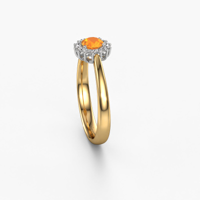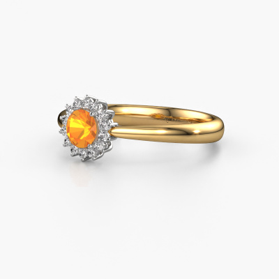 The ring shown above is called the Tilly RND 1. We call this type of ring a cluster ring. The center gemstone is surrounded by smaller sized stones. This 14 Carat gold version is set with a 4.2 mm round citrin center stone, embraced by smaller diamonds. What makes this classic gold cluster ring special is the setting of the smaller gems surrounding the center citrin, which are shaped like a beautiful flower. The surrounding cluster of stones frame the middle center stone in such a way to make it appear bigger. This type of engagement ring is also called a flower ring. It is very important that the smaller diamonds are positioned identically so there is no interference of light but perfect unity instead. Our skilled Goldsmiths get the job done. Each individual stone is carefully set by hand. During manufacturing, light fall is constantly monitored to make sure the special cluster effect is still visible. In the end you get the perfect engagement ring with a radiant citrin gemstone centerpiece. You can imagine the effect of a ring of such significance when you give tot the love of your life on her special day to shine. This jewel is made to shine bright around your finger. Each jewel is hand made with love by our goldsmiths.By using a combination of the latest modern techniques, combined with ancient crafting, we can make all our engagement rings in our own studio. Each jewel is made to order. This is advantageous because we can offer you a price you won't find anywhere else.Our team adds new designs to our online collection daily. Our designers and goldsmiths work together in creating the best design. We strive to offer a diverse collection of jewels. Perhaps you have a specific jewel design in mind. One you came across somewhere. Please contact us for a free consultation. We will make you an offer, based on a fair price/ quality ratio, that will baffle you.To make it easier for you, we offer a 30 day return policy. Check our terms and conditions.