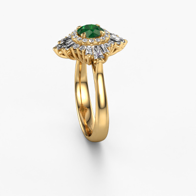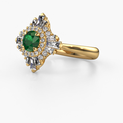 This 14 Carat gold ring is called Thalia and is set with 5.4 mm emerald. An extraordinary gold vintage ring. One that will surely make the love of your life shine like a diamond! That is what we hope to achieve. This vintage engagement ring is set with exquisite emerald. Whichever gemstone you choose from our selection, is up to you. The gemstone is selected with great care because we believe your special engagement ring must be adorned with nothing but the most beautiful gemstone. Wouldn't you agree? Our expert goldsmith will design your ring in our own crafting studio, where the emerald will be set with great precision. The ring will then be polished till it shines perfectly. Nothing but the best for the love of your life! This jewel is made with passion and love by one of our master goldsmiths.After receiving your order, our goldsmiths will passionately start the creative process of making your engagement ring in our own studio. Because we don't have a big stockpile, these costs will not be passed on to you. Our pricing is proof of that! We offer top quality jewels at lowest price, guaranteed.Have you found a specific engagement ring somewhere which you would like to give to your loved one? Please feel free to express your wishes to our jewel designers because we would be honored to turn your design into a vintage engagement ring. You can follow the development of your ring design because we use 3D drawings. This gives you a realistic preview of how your design will look. You can also preorder a dummy. A dummy is a plastic ring, which can be shaped according your ring design. You can try it on and check if its width and size are suitable for you. We will gladly send you a non-binding offer, based on a fair price/ quality ratio. It will amaze you, considering the quality of the ring and gemstones.To make it easier for you, we offer a 30 day return policy. Check our terms and conditions.