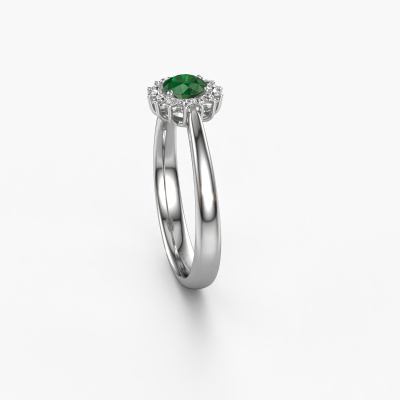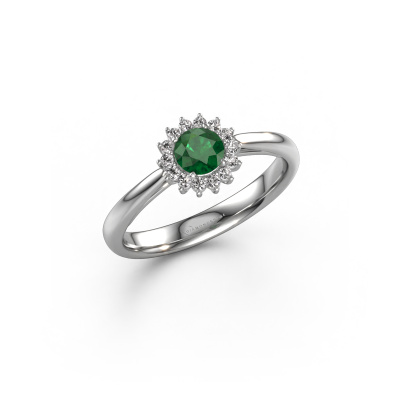 The ring shown above is called the Tilly RND 1. We call this type of ring a cluster ring. The center gemstone is surrounded by smaller sized stones. This 14 Carat white gold version is set with a 4.2 mm round emerald center stone, embraced by smaller diamonds. What makes this classic white gold cluster ring special is the setting of the smaller gems surrounding the center emerald, which are shaped like a beautiful flower. The surrounding cluster of stones frame the middle center stone in such a way to make it appear bigger. This type of engagement ring is also called a flower ring. It is very important that the smaller diamonds are positioned identically so there is no interference of light but perfect unity instead. Our skilled Goldsmiths get the job done. Each individual stone is carefully set by hand. During manufacturing, light fall is constantly monitored to make sure the special cluster effect is still visible. In the end you get the perfect engagement ring with a radiant emerald gemstone centerpiece. You can imagine the effect of a ring of such significance when you give tot the love of your life on her special day to shine. This jewel is made to shine bright around your finger. Each jewel is hand made with love by our goldsmiths.By using a combination of the latest modern techniques, combined with ancient crafting, we can make all our engagement rings in our own studio. Each jewel is made to order. This is advantageous because we can offer you a price you won't find anywhere else.Our team adds new designs to our online collection daily. Our designers and goldsmiths work together in creating the best design. We strive to offer a diverse collection of jewels. Perhaps you have a specific jewel design in mind. One you came across somewhere. Please contact us for a free consultation. We will make you an offer, based on a fair price/ quality ratio, that will baffle you.To make it easier for you, we offer a 30 day return policy. Check our terms and conditions.