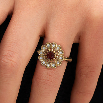 This 14 Carat gold ring is called Kaat and is set with 5 mm garnet. Is your girlfriend hooked on vintage? Then this gold pearl edges engagement ring will surely match her style perfectly. A trendy ring with just a hint of vintage adornment. A truly stunning, romantic design! Especially when you customize your ring to your own liking. This vintage cluster engagement ring is set with stunning garnet. As you can see, you are the boss in selecting a gemstone which matches the style of your girlfriend best. Each gemstone is carefully selected by our merchants whom are spread throughout the world. Nothing but the best gems for our expert goldsmith. After all, it is his crowning glory! Each jewel is created to add sparkle to your finger, each jewel is lovingly made by hand by our goldsmiths.Because we design and deliver our own rings, we can offer you a engagement ring at a price you won't find anywhere else. A ring is made to order, which helps prevent excess supplies, so we can make you a great price offer. We understand it feels risky, buying your engagement ring online, but we will gladly assist in the designing process, taking your budget into consideration.Our team adds new designs to our online collection daily. Our designers and goldsmiths work together in creating the best design. We strive to offer a diverse collection of jewels. Perhaps you have a specific jewel design in mind. One you came across somewhere. Please contact us for a free consultation. We will make you an offer, based on a fair price/ quality ratio, that will baffle you.To make it easier for you, we offer a 30 day return policy. Check our terms and conditions.