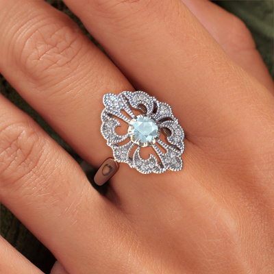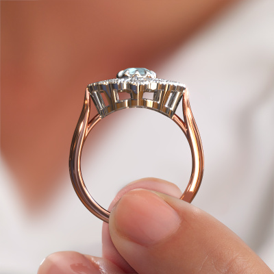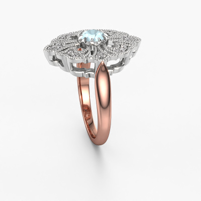 This 14 Carat rose gold ring is called Naida and is set with 5 mm aquamarine. Is your girlfriend hooked on vintage? Then this rose gold graceful engagement ring will surely match her style perfectly. A trendy ring with just a hint of vintage adornment. A truly stunning, romantic design! Especially when you customize your ring to your own liking. This vintage cluster engagement ring is set with stunning aquamarine. As you can see, you are the boss in selecting a gemstone which matches the style of your girlfriend best. Each gemstone is carefully selected by our merchants whom are spread throughout the world. Nothing but the best gems for our expert goldsmith. After all, it is his crowning glory! Each jewel is made just for you by our master goldsmiths in our own studio.By using a combination of the latest modern techniques, combined with ancient crafting, we can make all our engagement rings in our own studio. Each jewel is made to order. This is advantageous because we can offer you a price you won't find anywhere else.Do you have a specific ring in mind? One you came across somewhere. Please feel free to tell us your wishes and we will turn your design into a unique engagement ring. You can follow the development of your ring design because we use 3D drawings. This gives you a realistic preview of your design. We will gladly send you a non-binding offer, based on a fair price/ quality ratio. It will amaze you.To make it easier for you, we offer a 30 day return policy. Check our terms and conditions.