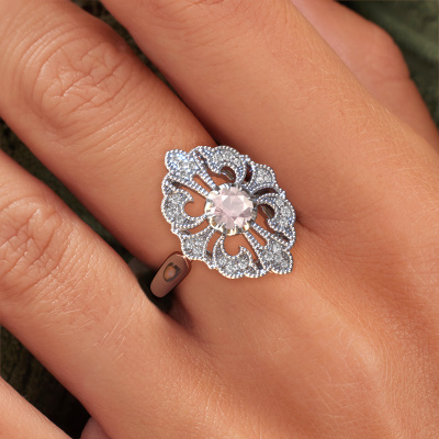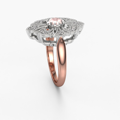 This 14 Carat rose gold ring is called Naida and is set with 5 mm morganite champagne. Is your girlfriend hooked on vintage? Then this rose gold graceful engagement ring will surely match her style perfectly. A trendy ring with just a hint of vintage adornment. A truly stunning, romantic design! Especially when you customize your ring to your own liking. This vintage cluster engagement ring is set with stunning morganite champagne. As you can see, you are the boss in selecting a gemstone which matches the style of your girlfriend best. Each gemstone is carefully selected by our merchants whom are spread throughout the world. Nothing but the best gems for our expert goldsmith. After all, it is his crowning glory! Each jewel is made just for you by our master goldsmiths in our own studio.By using a combination of the latest modern techniques, combined with ancient crafting, we can make all our engagement rings in our own studio. Each jewel is made to order. This is advantageous because we can offer you a price you won't find anywhere else.Do you have a specific ring in mind? One you came across somewhere. Please feel free to tell us your wishes and we will turn your design into a unique engagement ring. You can follow the development of your ring design because we use 3D drawings. This gives you a realistic preview of your design. We will gladly send you a non-binding offer, based on a fair price/ quality ratio. It will amaze you.To make it easier for you, we offer a 30 day return policy. Check our terms and conditions.