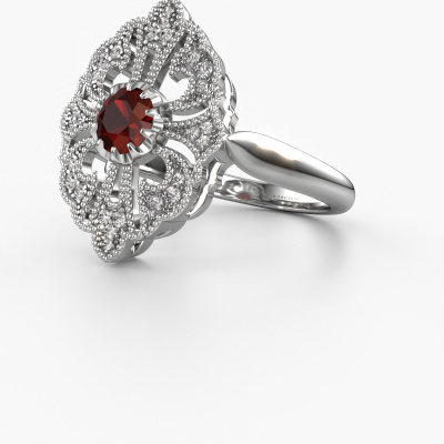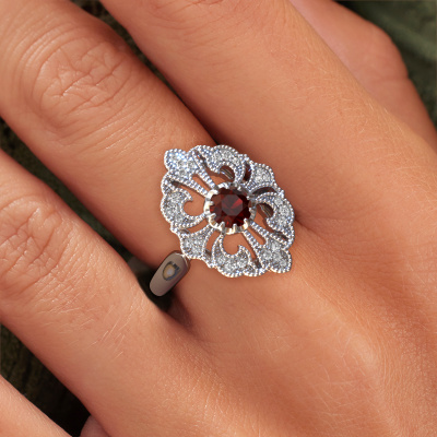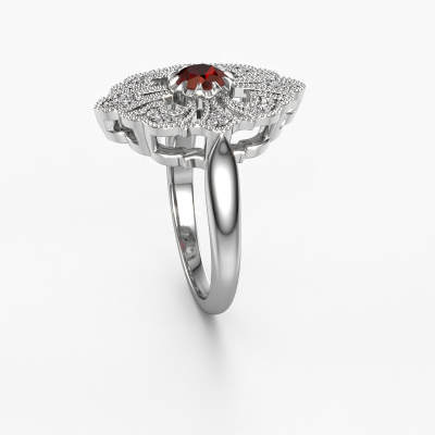 This 14 Carat white gold ring is called Naida and is set with 5 mm garnet. Is your girlfriend hooked on vintage? Then this white gold graceful engagement ring will surely match her style perfectly. A trendy ring with just a hint of vintage adornment. A truly stunning, romantic design! Especially when you customize your ring to your own liking. This vintage cluster engagement ring is set with stunning garnet. As you can see, you are the boss in selecting a gemstone which matches the style of your girlfriend best. Each gemstone is carefully selected by our merchants whom are spread throughout the world. Nothing but the best gems for our expert goldsmith. After all, it is his crowning glory! Each jewel is made just for you by our master goldsmiths in our own studio.By using a combination of the latest modern techniques, combined with ancient crafting, we can make all our engagement rings in our own studio. Each jewel is made to order. This is advantageous because we can offer you a price you won't find anywhere else.Do you have a specific ring in mind? One you came across somewhere. Please feel free to tell us your wishes and we will turn your design into a unique engagement ring. You can follow the development of your ring design because we use 3D drawings. This gives you a realistic preview of your design. We will gladly send you a non-binding offer, based on a fair price/ quality ratio. It will amaze you.To make it easier for you, we offer a 30 day return policy. Check our terms and conditions.