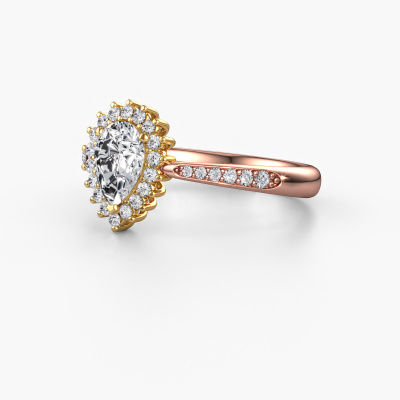 The ring shown above is called the Tilly per 2. We call this type of ring a cluster ring. The center gemstone is surrounded by smaller sized stones. This 14 Carat rose gold version is set with a 0.65 crt pear lab-grown diamond center stone, embraced by smaller diamonds. What makes this exclusive rose gold cluster ring special is the setting of the smaller gems surrounding the center lab-grown diamond, which are shaped like a beautiful flower. The surrounding cluster of stones frame the middle center stone in such a way to make it appear bigger. This type of engagement ring is also called a flower ring. It is very important that the smaller diamonds are positioned identically so there is no interference of light but perfect unity instead. Our skilled Goldsmiths get the job done. Each individual stone is carefully set by hand. During manufacturing, light fall is constantly monitored to make sure the special cluster effect is still visible. In the end you get the perfect engagement ring with a radiant lab-grown diamond gemstone centerpiece. You can imagine the effect of a ring of such significance when you give tot the love of your life on her special day to shine. This jewel is made just for you, with attention to detail and design.After receiving your order, our goldsmiths will passionately start the creative process of making your engagement ring in our own studio. Because we don't have a big stockpile, these costs will not be passed on to you. Our pricing is proof of that! We offer top quality jewels at lowest price, guaranteed.Different styles of new rings are made daily by our team. Perhaps you have found a cluster engagement ring somewhere. One you would like to give to your loved one. Please feel free to share your thoughts and design with our jewel designers. We would love to turn your design into a exclusive engagement ring. You can follow the development of your ring design because we use very detailed 3D drawings. On top of that, you can order a dummy of the design. A dummy is a plastic ring, which can be shaped according your ring design. You can try it on and check if the engagement ring is up to standard. We will gladly send you a non-binding offer, based on a fair price/ quality ratio. The offer will baffle you, considering the quality of the ring and gemstones.To make it easier for you, we offer a 30 day return policy. Check our terms and conditions.