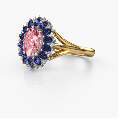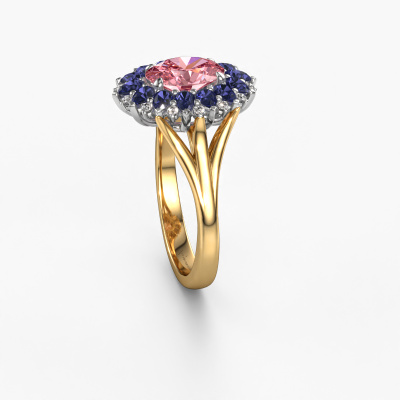 The ring shown above is called the Lidia. We call this type of ring a cluster ring. The center gemstone is surrounded by smaller sized stones. This 14 Carat gold version is set with a 8x6 mm oval pink lab grown diamond center stone, embraced by smaller sapphire. What makes this vintage gold cluster ring special is the setting of the smaller gems surrounding the center pink lab grown diamond, which are shaped like a beautiful flower. The surrounding cluster of stones frame the middle center stone in such a way to make it appear bigger. This type of engagement ring is also called a flower ring. It is very important that the smaller sapphire are positioned identically so there is no interference of light but perfect unity instead. Our skilled Goldsmiths get the job done. Each individual stone is carefully set by hand. During manufacturing, light fall is constantly monitored to make sure the special cluster effect is still visible. In the end you get the perfect engagement ring with a radiant pink lab grown diamond gemstone centerpiece. You can imagine the effect of a ring of such significance when you give tot the love of your life on her special day to shine. This jewel is made with passion and love by one of our master goldsmiths.By using a combination of the latest modern techniques, combined with ancient crafting, we can make all our engagement rings in our own studio. Each jewel is made to order. This is advantageous because we can offer you a price you won't find anywhere else.Have you found a specific engagement ring somewhere which you would like to give to your loved one? Please feel free to express your wishes to our jewel designers because we would be honored to turn your design into a vintage engagement ring. You can follow the development of your ring design because we use 3D drawings. This gives you a realistic preview of how your design will look. You can also preorder a dummy. A dummy is a plastic ring, which can be shaped according your ring design. You can try it on and check if its width and size are suitable for you. We will gladly send you a non-binding offer, based on a fair price/ quality ratio. It will amaze you, considering the quality of the ring and gemstones.To make it easier for you, we offer a 30 day return policy. Check our terms and conditions.