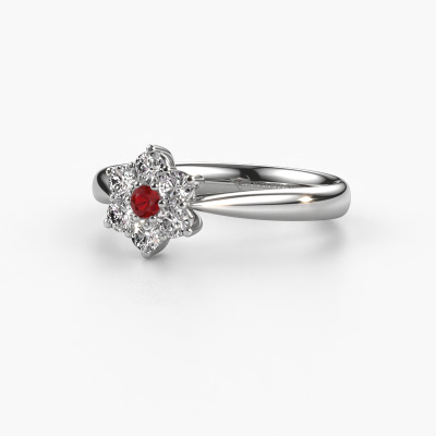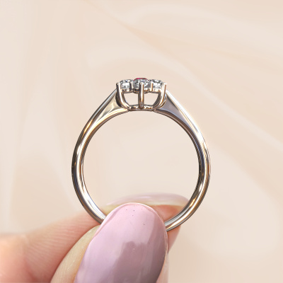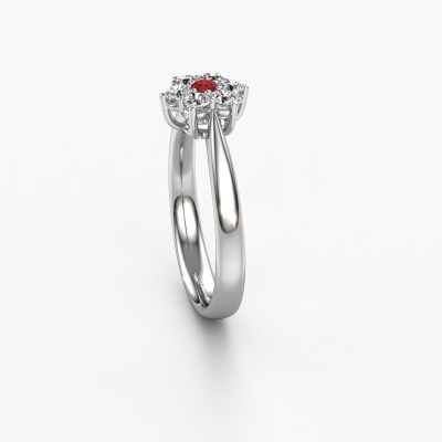 The ring shown above is called the Chantal 1. We call this type of ring a cluster ring. The center gemstone is surrounded by smaller sized stones. This platinum version is set with a 2.4 mm round ruby center stone, embraced by smaller diamonds. What makes this traditional platinum cluster ring special is the setting of the smaller gems surrounding the center ruby, which are shaped like a beautiful flower. The surrounding cluster of stones frame the middle center stone in such a way to make it appear bigger. This type of promise ring is also called a flower ring. It is very important that the smaller diamonds are positioned identically so there is no interference of light but perfect unity instead. Our skilled Goldsmiths get the job done. Each individual stone is carefully set by hand. During manufacturing, light fall is constantly monitored to make sure the special cluster effect is still visible. In the end you get the perfect promise ring with a radiant ruby gemstone centerpiece. You can imagine the effect of a ring of such significance when you give tot the love of your life on her special day to shine. This jewel is unique in every way! Simply customize to your liking,By using our modern techniques, we can design and customize the finest quality jewels with the utmost care for you. Our promise ring are always priced 30 percent lower than other jewelers. We make promise ring to order so we don't have to maintain a large stock. If you have a certain budget, we are more than happy to advice you accordingly.Our designers and goldsmiths work together each day, creating new jewels. Perhaps you have found a nice traditional promise ring somewhere, which can be used to customize your unique ring. Please feel free to contact us. We will make you an offer, based on a fair price/ quality ratio, which will amaze you.To make it easier for you, we offer a 30 day return policy. Check our terms and conditions.
