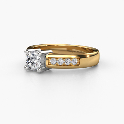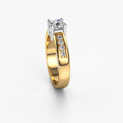 The ring shown above is called the Eline 2. We call this type of ring a pavé solitaire ring because it has one center gemstone and a band that is also pave set with gemstones. The 14 Carat gold engagement ring is set with a round 0.40 crt diamond center stone and the band is pave set with diamond gemstones. Each jewel is unique in every way! Simply customize to your liking,This modern gold pavé solitaire engagement ring has an exquisite round diamond center stone. To further accentuate the center stone, the band is fully set with more diamonds. Its open prong setting allows light to strike the diamond from various angles and this adds sparkle to your diamond ring. The photo shown above depicts the goldsmith's carefully handcrafted details of the ring. The high positioning of the center stone is truly eye-catching. The perfect engagement ring for the crown jewel of your life! Because we design and deliver our own rings, we can offer you a engagement ring at a price you won't find anywhere else. A ring is made to order, which helps prevent excess supplies, so we can make you a great price offer. We understand it feels risky, buying your engagement ring online, but we will gladly assist in the designing process, taking your budget into consideration.Our team adds new designs to our online collection daily. Our designers and goldsmiths work together in creating the best design. We strive to offer a diverse collection of jewels. Perhaps you have a specific jewel design in mind. One you came across somewhere. Please contact us for a free consultation. We will make you an offer, based on a fair price/ quality ratio, that will baffle you.To make it easier for you, we offer a 30 day return policy. Check our terms and conditions.