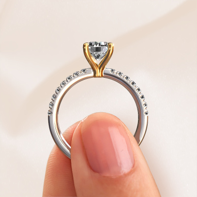 The ring shown above is called the Crystal RND 2. We call this type of ring a pavé solitaire ring because it has one center gemstone and a band that is also pave set with gemstones. The 14 Carat white gold engagement ring is set with a round 1.00 crt diamond center stone and the band is pave set with lab-grown diamond gemstones. Each jewel is unique in every way! Simply customize to your liking,This classic white gold pavé solitaire engagement ring has an exquisite round diamond center stone. To further accentuate the center stone, the band is fully set with more lab grown diamonds. Its open prong setting allows light to strike the diamond from various angles and this adds sparkle to your diamond ring. The photo shown above depicts the goldsmith's carefully handcrafted details of the ring. The high positioning of the center stone is truly eye-catching. The perfect engagement ring for the crown jewel of your life! After receiving your order, our goldsmiths will start the creative process of making your Crystal RND 2 engagement ring. We don't keep stock. This is advantageous because these costs will not be passed on to you. Therefore, we can offer jewelry at exceptionally low prices.Different styles of new rings are made daily by our team. Perhaps you have found a pavé solitaire engagement ring somewhere. One you would like to give to your loved one. Please feel free to share your thoughts and design with our jewel designers. We would love to turn your design into a classic engagement ring. You can follow the development of your ring design because we use very detailed 3D drawings. On top of that, you can order a dummy of the design. A dummy is a plastic ring, which can be shaped according your ring design. You can try it on and check if the engagement ring is up to standard. We will gladly send you a non-binding offer, based on a fair price/ quality ratio. The offer will baffle you, considering the quality of the ring and gemstones.To make it easier for you, we offer a 30 day return policy. Check our terms and conditions.