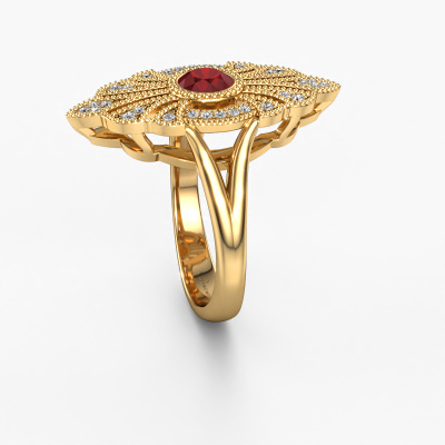 This 14 Carat gold ring is called Hanna and is set with 5 mm ruby. This filigree gold engagement ring is a true work of art! A beautifully adorned design of intricate wires. With dedication, patience and the utmost precision, our expert goldsmith will design a ring just for you. The adornment of small wiring is crafted to perfection by hand. It's a lengthy process which includes welding, crafting and polishing until our Goldsmiths are completely satisfied with the result: a perfect eye-catching ring that makes her shine with delight. Therefore the vintage filigree engagement ring is an extraordinary gift to bestow upon the love of your life. A handmade one-of-a-kind personalized ring, to be given to that special someone on that special moment when you pop the question. Isn't that wonderful? This piece of jewelry is created to add sparkle to your finger, each jewel is lovingly made by hand by our goldsmiths.After receiving your order, our goldsmiths will passionately start the creative process of making your engagement ring in our own studio. Because we don't have a big stockpile, these costs will not be passed on to you. Our pricing is proof of that! We offer top quality jewels at lowest price, guaranteed.Our team adds new designs to our online collection daily. Our designers and goldsmiths work together in creating the best design. We strive to offer a diverse collection of jewels. Perhaps you have a specific jewel design in mind. One you came across somewhere. Please contact us for a free consultation. We will make you an offer, based on a fair price/ quality ratio, that will baffle you.To make it easier for you, we offer a 30 day return policy. Check our terms and conditions.