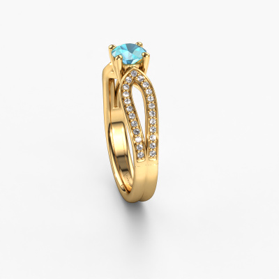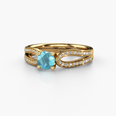 The ring shown above is called the Antonia rnd 2. We call this type of ring a pavé solitaire ring because it has one center gemstone and a band that is also pave set with gemstones. The 14 Carat gold engagement ring is set with a round 5 mm blue topaz center stone and the band is pave set with diamond gemstones. Each jewel is made just for you, with attention to detail and design.This traditional gold pavé solitaire engagement ring has an exquisite round blue topaz center stone. To further accentuate the center stone, the band is fully set with more diamonds. Its open prong setting allows light to strike the blue topaz from various angles and this adds sparkle to your blue topaz ring. The photo shown above depicts the goldsmith's carefully handcrafted details of the ring. The high positioning of the center stone is truly eye-catching. The perfect engagement ring for the crown jewel of your life! After receiving your order, our goldsmiths will start the creative process of making your Antonia rnd 2 engagement ring. We don't keep stock. This is advantageous because these costs will not be passed on to you. Therefore, we can offer jewelry at exceptionally low prices.Have you found a specific engagement ring somewhere which you would like to give to your loved one? Please feel free to express your wishes to our jewel designers because we would be honored to turn your design into a traditional engagement ring. You can follow the development of your ring design because we use 3D drawings. This gives you a realistic preview of how your design will look. You can also preorder a dummy. A dummy is a plastic ring, which can be shaped according your ring design. You can try it on and check if its width and size are suitable for you. We will gladly send you a non-binding offer, based on a fair price/ quality ratio. It will amaze you, considering the quality of the ring and gemstones.To make it easier for you, we offer a 30 day return policy. Check our terms and conditions.