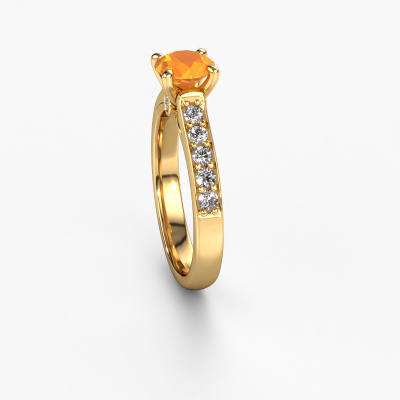 The ring shown above is called the Valorie RND 2. We call this type of ring a pavé solitaire ring because it has one center gemstone and a band that is also pave set with gemstones. The 14 Carat gold engagement ring is set with a round 6.5 mm citrin center stone and the band is pave set with lab-grown diamond gemstones. Each jewel is made just for you, with attention to detail and design.This modern gold pavé solitaire engagement ring has an exquisite round citrin center stone. To further accentuate the center stone, the band is fully set with more lab grown diamonds. Its open prong setting allows light to strike the citrin from various angles and this adds sparkle to your citrin ring. The photo shown above depicts the goldsmith's carefully handcrafted details of the ring. The high positioning of the center stone is truly eye-catching. The perfect engagement ring for the crown jewel of your life! By using our modern techniques, we can design and customize the finest quality jewels with the utmost care for you. Our engagement rings are always priced 30 percent lower than other jewelers. We make engagement rings to order so we don't have to maintain a large stock. If you have a certain budget, we are more than happy to advice you accordingly.Our designers and goldsmiths work together each day, creating new jewels. Perhaps you have found a nice modern engagement ring somewhere, which can be used to customize your unique ring. Please feel free to contact us. We will make you an offer, based on a fair price/ quality ratio, which will amaze you.To make it easier for you, we offer a 30 day return policy. Check our terms and conditions.