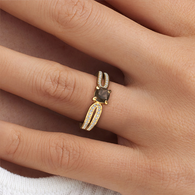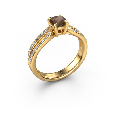 The ring shown above is called the Antonia cus 2. We call this type of ring a pavé solitaire ring because it has one center gemstone and a band that is also pave set with gemstones. The 14 Carat gold engagement ring is set with a cushion 5 mm smokey quartz center stone and the band is pave set with lab-grown diamond gemstones. Each jewel is made just for you by our master goldsmiths in our own studio.This fantasy gold pavé solitaire engagement ring has an exquisite cushion smokey quartz center stone. To further accentuate the center stone, the band is fully set with more lab grown diamonds. Its open prong setting allows light to strike the smokey quartz from various angles and this adds sparkle to your smokey quartz ring. The photo shown above depicts the goldsmith's carefully handcrafted details of the ring. The high positioning of the center stone is truly eye-catching. The perfect engagement ring for the crown jewel of your life! By using our modern techniques, we can design and customize the finest quality jewels with the utmost care for you. Our engagement rings are always priced 30 percent lower than other jewelers. We make engagement rings to order so we don't have to maintain a large stock. If you have a certain budget, we are more than happy to advice you accordingly.Have you found a specific engagement ring somewhere which you would like to give to your loved one? Please feel free to express your wishes to our jewel designers because we would be honored to turn your design into a fantasy engagement ring. You can follow the development of your ring design because we use 3D drawings. This gives you a realistic preview of how your design will look. You can also preorder a dummy. A dummy is a plastic ring, which can be shaped according your ring design. You can try it on and check if its width and size are suitable for you. We will gladly send you a non-binding offer, based on a fair price/ quality ratio. It will amaze you, considering the quality of the ring and gemstones.To make it easier for you, we offer a 30 day return policy. Check our terms and conditions.