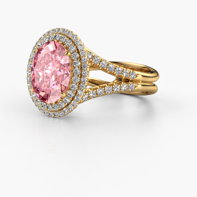 The ring shown above is called the Elvie. We call this type of ring a halo ring because it has one center gemstone and a band that is also pave set with gemstones. The 14 Carat gold engagement ring is set with a oval 10x8 mm pink lab grown diamond center stone and the band is pave set with lab grown diamonds. What makes this vintage gold pavé solitaire ring special are the smaller sized stones embracing the center stone. This gorgeous engagement ring is called a pavé solitaire ring because the smaller gemstones give the center stone a pavé solitaire of surrounding light. In order for the smaller stones to enhance the center stone, they have to be placed so there is no interference of light. And that's when our expert goldsmiths come in. Each individual stone is carefully set in the ring by hand. During manufacturing, light fall is constantly monitored to make sure the special pavé solitaire is still visible. In the end you get a unique engagement ring, with a pink lab grown diamond of your choosing at its centre. You can imagine the effect of a ring of such significance when you give it to her on her special day to shine. By using our modern techniques, we can design and customize the finest quality jewels with the utmost care for you. Our engagement rings are always priced 30 percent lower than other jewelers. We make engagement rings to order so we don't have to maintain a large stock. If you have a certain budget, we are more than happy to advice you accordingly.Do you have a specific ring in mind? One you came across somewhere. Please feel free to tell us your wishes and we will turn your design into a unique engagement ring. You can follow the development of your ring design because we use 3D drawings. This gives you a realistic preview of your design. We will gladly send you a non-binding offer, based on a fair price/ quality ratio. It will amaze you.To make it easier for you, we offer a 30 day return policy. Check our terms and conditions.