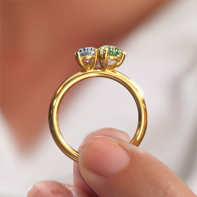 This 14 Carat gold ring is called Toi et Moi PER-RND and is set with green lab grown diamond. How would you describe the style of the love of your life? Does she have a unique sense of style? This stunning sublime gold engagement ring can be custom made to your own or her liking. Our green lab grown diamondd gemstones have been carefully selected because we believe your fantasy engagement ring must be adorned with nothing but the most beautiful gemstone. Don't you agree? This jewel is unique in every way! Simply customize to your liking,By using our modern techniques, we can design and customize the finest quality jewels with the utmost care for you. Our engagement rings are always priced 30 percent lower than other jewelers. We make engagement rings to order so we don't have to maintain a large stock. If you have a certain budget, we are more than happy to advice you accordingly.Our designers and goldsmiths work together each day, creating new jewels. Perhaps you have found a nice fantasy engagement ring somewhere, which can be used to customize your unique ring. Please feel free to contact us. We will make you an offer, based on a fair price/ quality ratio, which will amaze you.To make it easier for you, we offer a 30 day return policy. Check our terms and conditions.
