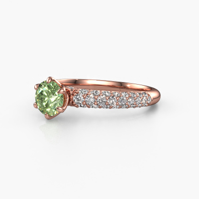 The ring shown above is called the Meryl. We call this type of ring a pavé solitaire ring because it has one center gemstone and a band that is also pave set with gemstones. This engagement ring is made in 14 Carat rose gold set with a 5.7 mm round green lab grown diamond, and pave set diamonds at the sides. Each piece of jewelry is made just for you, with attention to detail and design.This exclusive rose gold pavé solitaire engagement ring has an exquisite round green lab grown diamond center stone. To further accentuate the center stone, the band is set full with more diamonds. Its open prong setting allows light to strike the green lab grown diamond from various angles and this adds sparkle to your green lab grown diamond ring. The photo shown above depicts the goldsmith's carefully handcrafted details of the ring. The high positioning of the center stone is truly eye-catching. The perfect engagement ring for the crown jewel of your life!After receiving your order, our goldsmiths will passionately start the creative process of making your engagement ring in our own studio. Because we don't have a big stockpile, these costs will not be passed on to you. Our pricing is proof of that! We offer top quality jewels at lowest price, guaranteed.Have you found a specific engagement ring somewhere which you would like to give to your loved one? Please feel free to express your wishes to our jewel designers because we would be honored to turn your design into a exclusive engagement ring. You can follow the development of your ring design because we use 3D drawings. This gives you a realistic preview of how your design will look. You can also preorder a dummy. A dummy is a plastic ring, which can be shaped according your ring design. You can try it on and check if its width and size are suitable for you. We will gladly send you a non-binding offer, based on a fair price/ quality ratio. It will amaze you, considering the quality of the ring and gemstones.To make it easier for you, we offer a 30 day return policy. Check our terms and conditions.