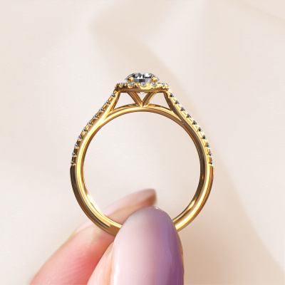 The ring shown above is called the Seline rnd 2. We call this type of ring a halo ring because it has one center gemstone and a band that is also pave set with gemstones. The 14 Carat gold engagement ring is set with a round 0.50 crt diamond center stone and the band is pave set with lab grown diamonds. What makes this exclusive gold halo ring special are the smaller sized stones embracing the center stone. This gorgeous engagement ring is called a halo ring because the smaller gemstones give the center stone a halo of surrounding light. In order for the smaller stones to enhance the center stone, they have to be placed so there is no interference of light. And that's when our expert goldsmiths come in. Each individual stone is carefully set in the ring by hand. During manufacturing, light fall is constantly monitored to make sure the special halo is still visible. In the end you get a unique engagement ring, with a diamond of your choosing at its centre. You can imagine the effect of a ring of such significance when you give it to her on her special day to shine. After receiving your order, our goldsmiths will start the creative process of making your Seline rnd 2 engagement ring. We don't keep stock. This is advantageous because these costs will not be passed on to you. Therefore, we can offer jewelry at exceptionally low prices.Our team adds new designs to our online collection daily. Our designers and goldsmiths work together in creating the best design. We strive to offer a diverse collection of jewels. Perhaps you have a specific jewel design in mind. One you came across somewhere. Please contact us for a free consultation. We will make you an offer, based on a fair price/ quality ratio, that will baffle you.To make it easier for you, we offer a 30 day return policy. Check our terms and conditions.