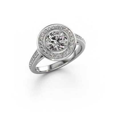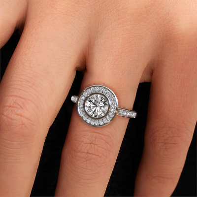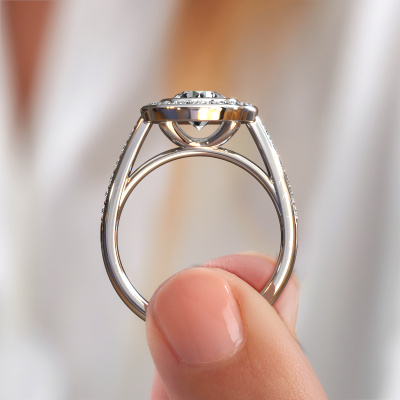 The ring shown above is called the Noud 2 RND. We call this type of ring a halo ring because it has one center gemstone and a band that is also pave set with gemstones. The platinum engagement ring is set with a round 1.00 crt diamond center stone and the band is pave set with diamonds. What makes this luxury platinum halo ring special are the smaller sized stones embracing the center stone. This gorgeous engagement ring is called a halo ring because the smaller gemstones give the center stone a halo of surrounding light. In order for the smaller stones to enhance the center stone, they have to be placed so there is no interference of light. And that's when our expert goldsmiths come in. Each individual stone is carefully set in the ring by hand. During manufacturing, light fall is constantly monitored to make sure the special halo is still visible. In the end you get a unique engagement ring, with a diamond of your choosing at its centre. You can imagine the effect of a ring of such significance when you give it to her on her special day to shine. By using a combination of the latest modern techniques, combined with ancient crafting, we can make all our engagement rings in our own studio. Each jewel is made to order. This is advantageous because we can offer you a price you won't find anywhere else.Have you found a specific engagement ring somewhere which you would like to give to your loved one? Please feel free to express your wishes to our jewel designers because we would be honored to turn your design into a luxury engagement ring. You can follow the development of your ring design because we use 3D drawings. This gives you a realistic preview of how your design will look. You can also preorder a dummy. A dummy is a plastic ring, which can be shaped according your ring design. You can try it on and check if its width and size are suitable for you. We will gladly send you a non-binding offer, based on a fair price/ quality ratio. It will amaze you, considering the quality of the ring and gemstones.To make it easier for you, we offer a 30 day return policy. Check our terms and conditions.