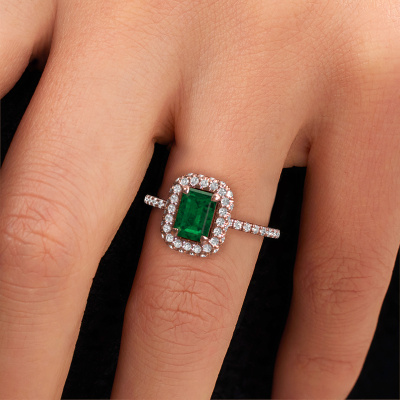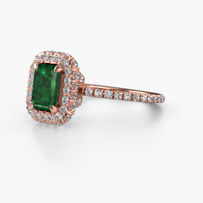 The ring shown above is called the Talitha EME. We call this type of ring a halo ring because it has one center gemstone and a band that is also pave set with gemstones. The 14 Carat rose gold engagement ring is set with a emerald cut 7x5 mm emerald center stone and the band is pave set with lab grown diamonds. What makes this luxury rose gold halo ring special are the smaller sized stones embracing the center stone. This gorgeous engagement ring is called a halo ring because the smaller gemstones give the center stone a halo of surrounding light. In order for the smaller stones to enhance the center stone, they have to be placed so there is no interference of light. And that's when our expert goldsmiths come in. Each individual stone is carefully set in the ring by hand. During manufacturing, light fall is constantly monitored to make sure the special halo is still visible. In the end you get a unique engagement ring, with a emerald of your choosing at its centre. You can imagine the effect of a ring of such significance when you give it to her on her special day to shine. By using our modern techniques, we can design and customize the finest quality jewels with the utmost care for you. Our engagement rings are always priced 30 percent lower than other jewelers. We make engagement rings to order so we don't have to maintain a large stock. If you have a certain budget, we are more than happy to advice you accordingly.Our team adds new designs to our online collection daily. Our designers and goldsmiths work together in creating the best design. We strive to offer a diverse collection of jewels. Perhaps you have a specific jewel design in mind. One you came across somewhere. Please contact us for a free consultation. We will make you an offer, based on a fair price/ quality ratio, that will baffle you.To make it easier for you, we offer a 30 day return policy. Check our terms and conditions.