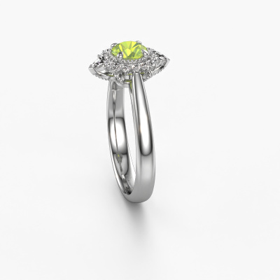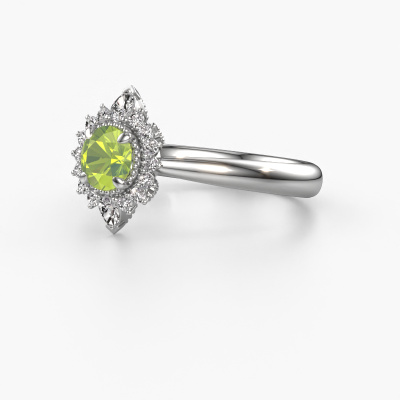 This 14 Carat white gold ring is called Susan and is set with 5 mm peridot. Is your girlfriend hooked on vintage? Then this white gold tasteful engagement ring will surely match her style perfectly. A trendy ring with just a hint of vintage adornment. A truly stunning, romantic design! Especially when you customize your ring to your own liking. This vintage halo engagement ring is set with stunning peridot. As you can see, you are the boss in selecting a gemstone which matches the style of your girlfriend best. Each gemstone is carefully selected by our merchants whom are spread throughout the world. Nothing but the best gems for our expert goldsmith. After all, it is his crowning glory! Each jewel is made just for you, with attention to detail and design.By using a combination of the latest modern techniques, combined with ancient crafting, we can make all our engagement rings in our own studio. Each jewel is made to order. This is advantageous because we can offer you a price you won't find anywhere else.Our team adds new designs to our online collection daily. Our designers and goldsmiths work together in creating the best design. We strive to offer a diverse collection of jewels. Perhaps you have a specific jewel design in mind. One you came across somewhere. Please contact us for a free consultation. We will make you an offer, based on a fair price/ quality ratio, that will baffle you.To make it easier for you, we offer a 30 day return policy. Check our terms and conditions.