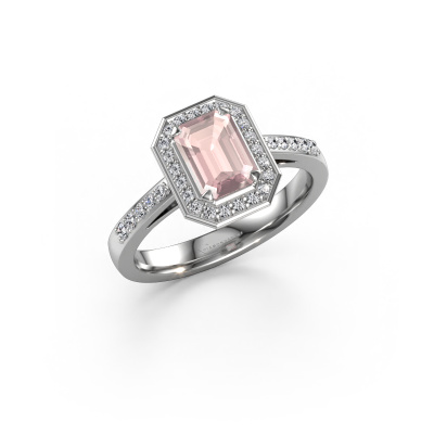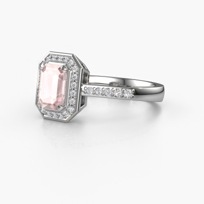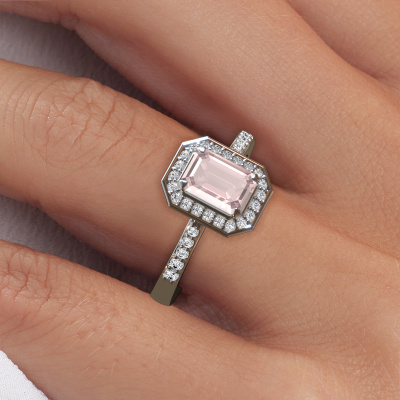 This platinum ring is called Dodie 2 eme and is set with 7x5 mm morganite champagne. This exclusive platinum halo engagement ring is a true work of art! The ornaments are crafted with a lot of patience and great passion. In order to create this ring with great precision, this craft requires a keen eye and skillful hand. A challenge which ignites a fire in our expert goldsmith. The exquisite morganite champagne are set in a special way so they stand out even more. This gives the ring an even more glamorous appearance. The pretty engagement ring is actually unique on its own because of the gemstones which we carefully select especially for this ring. On top of that you select the precious metals which will be used to create a unique ring for the most extraordinary woman in your life! This jewel is made just for you, with attention to detail and design.Because we design and deliver our own rings, we can offer you a engagement ring at a price you won't find anywhere else. A ring is made to order, which helps prevent excess supplies, so we can make you a great price offer. We understand it feels risky, buying your engagement ring online, but we will gladly assist in the designing process, taking your budget into consideration.Do you have a specific ring in mind? One you came across somewhere. Please feel free to tell us your wishes and we will turn your design into a unique engagement ring. You can follow the development of your ring design because we use 3D drawings. This gives you a realistic preview of your design. We will gladly send you a non-binding offer, based on a fair price/ quality ratio. It will amaze you.To make it easier for you, we offer a 30 day return policy. Check our terms and conditions.