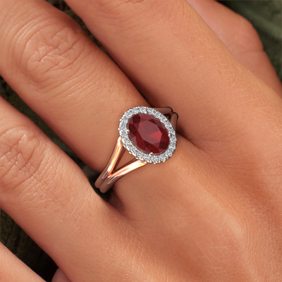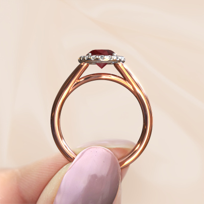 This 14 Carat rose gold ring is called Verla ovl 1 and is set with 8x6 mm ruby. This exclusive rose gold halo engagement ring is a true work of art! The ornaments are crafted with a lot of patience and great passion. In order to create this ring with great precision, this craft requires a keen eye and skillful hand. A challenge which ignites a fire in our expert goldsmith. The exquisite ruby are set in a special way so they stand out even more. This gives the ring an even more glamorous appearance. The split band engagement ring is actually unique on its own because of the gemstones which we carefully select especially for this ring. On top of that you select the precious metals which will be used to create a unique ring for the most extraordinary woman in your life! This jewel is made to shine bright around your finger. Each jewel is hand made with love by our goldsmiths.By using a combination of the latest modern techniques, combined with ancient crafting, we can make all our engagement rings in our own studio. Each jewel is made to order. This is advantageous because we can offer you a price you won't find anywhere else.Do you have a specific ring in mind? One you came across somewhere. Please feel free to tell us your wishes and we will turn your design into a unique engagement ring. You can follow the development of your ring design because we use 3D drawings. This gives you a realistic preview of your design. We will gladly send you a non-binding offer, based on a fair price/ quality ratio. It will amaze you.To make it easier for you, we offer a 30 day return policy. Check our terms and conditions.