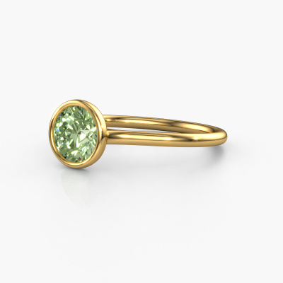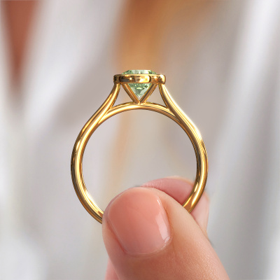 The ring shown above is called the Lavon RND. We call this a solitaire ring because it contains a single gemstone. The engagement ring is made in 14 Carat gold and has a round green lab grown diamond of 6.5 mm. This extraordinary modern gold solitaire engagement ring is set with a beautiful round green lab grown diamond to add sparkle to your proposal. The open prong setting allows light to strike the gemstone from various angles. Did you know a diamond represents everlasting love and fidelity? This makes it a perfect centerpiece. Our goldsmith carefully positions the gemstone of your choosing high on top of the ring, which makes it stand out. Each piece of jewelry is made by a team of passionate goldsmiths and jewel designers. This will make your crown jewel truly eye-catching.Are you on a budget? Please feel free to contact us, so we can go discuss your options. We offer our engagement rings at guaranteed best price, because we make them to order. You won't find such a price anywhere else!Our team adds new designs to our online collection daily. Our designers and goldsmiths work together in creating the best design. We strive to offer a diverse collection of jewels. Perhaps you have a specific jewel design in mind. One you came across somewhere. Please contact us for a free consultation. We will make you an offer, based on a fair price/ quality ratio, that will baffle you.To make it easier for you, we offer a 30 day return policy. Check our terms and conditions.