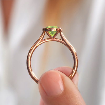 The ring shown above is called the Lavon RND. We call this a solitaire ring because it contains a single gemstone. The engagement ring is made in 14 Carat rose gold and has a round peridot of 6.5 mm. This extraordinary modern rose gold solitaire engagement ring is set with a beautiful round peridot to add sparkle to your proposal. The open prong setting allows light to strike the gemstone from various angles. Did you know a diamond represents everlasting love and fidelity? This makes it a perfect centerpiece. Our goldsmith carefully positions the gemstone of your choosing high on top of the ring, which makes it stand out. Each piece of jewelry is made by a team of passionate goldsmiths and jewel designers. This will make your crown jewel truly eye-catching.Are you on a budget? Please feel free to contact us, so we can go discuss your options. We offer our engagement rings at guaranteed best price, because we make them to order. You won't find such a price anywhere else!Our team adds new designs to our online collection daily. Our designers and goldsmiths work together in creating the best design. We strive to offer a diverse collection of jewels. Perhaps you have a specific jewel design in mind. One you came across somewhere. Please contact us for a free consultation. We will make you an offer, based on a fair price/ quality ratio, that will baffle you.To make it easier for you, we offer a 30 day return policy. Check our terms and conditions.