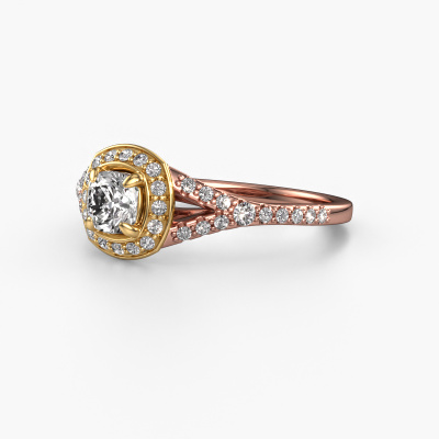 The ring shown above is called the Pamela CUS. We call this type of ring a halo ring because it has one center gemstone and a band that is also pave set with gemstones. The 14 Carat rose gold engagement ring is set with a cushion 0.50 crt diamond center stone and the band is pave set with lab grown diamonds. What makes this luxury rose gold pavé solitaire ring special are the smaller sized stones embracing the center stone. This gorgeous engagement ring is called a pavé solitaire ring because the smaller gemstones give the center stone a pavé solitaire of surrounding light. In order for the smaller stones to enhance the center stone, they have to be placed so there is no interference of light. And that's when our expert goldsmiths come in. Each individual stone is carefully set in the ring by hand. During manufacturing, light fall is constantly monitored to make sure the special pavé solitaire is still visible. In the end you get a unique engagement ring, with a diamond of your choosing at its centre. You can imagine the effect of a ring of such significance when you give it to her on her special day to shine. After receiving your order, our goldsmiths will passionately start the creative process of making your engagement ring in our own studio. Because we don't have a big stockpile, these costs will not be passed on to you. Our pricing is proof of that! We offer top quality jewels at lowest price, guaranteed.Different styles of new rings are made daily by our team. Perhaps you have found a pavé solitaire engagement ring somewhere. One you would like to give to your loved one. Please feel free to share your thoughts and design with our jewel designers. We would love to turn your design into a luxury engagement ring. You can follow the development of your ring design because we use very detailed 3D drawings. On top of that, you can order a dummy of the design. A dummy is a plastic ring, which can be shaped according your ring design. You can try it on and check if the engagement ring is up to standard. We will gladly send you a non-binding offer, based on a fair price/ quality ratio. The offer will baffle you, considering the quality of the ring and gemstones.To make it easier for you, we offer a 30 day return policy. Check our terms and conditions.