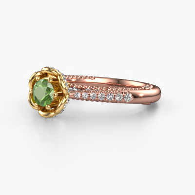 This 14 Carat rose gold ring is called Abbey and is set with 4.2 mm tourmaline green. Is your girlfriend hooked on vintage? Then this rose gold pearl edges engagement ring will surely match her style perfectly. A trendy ring with just a hint of vintage adornment. A truly stunning, romantic design! Especially when you customize your ring to your own liking. This vintage pavé solitaire engagement ring is set with stunning tourmaline green. As you can see, you are the boss in selecting a gemstone which matches the style of your girlfriend best. Each gemstone is carefully selected by our merchants whom are spread throughout the world. Nothing but the best gems for our expert goldsmith. After all, it is his crowning glory! Each jewel is made just for you, with attention to detail and design.By using our modern techniques, we can design and customize the finest quality jewels with the utmost care for you. Our engagement rings are always priced 30 percent lower than other jewelers. We make engagement rings to order so we don't have to maintain a large stock. If you have a certain budget, we are more than happy to advice you accordingly.Our designers and goldsmiths work together each day, creating new jewels. Perhaps you have found a nice vintage engagement ring somewhere, which can be used to customize your unique ring. Please feel free to contact us. We will make you an offer, based on a fair price/ quality ratio, which will amaze you.To make it easier for you, we offer a 30 day return policy. Check our terms and conditions.