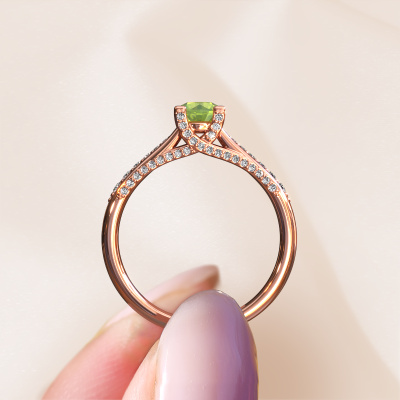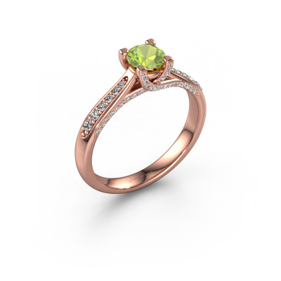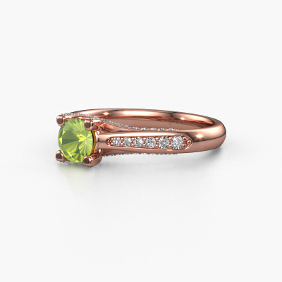 This 14 Carat rose gold ring is called Mia 3 and is set with 5 mm peridot. This exclusive rose gold pavé solitaire engagement ring is a true work of art! The ornaments are crafted with a lot of patience and great passion. In order to create this ring with great precision, this craft requires a keen eye and skillful hand. A challenge which ignites a fire in our expert goldsmith. The exquisite peridot are set in a special way so they stand out even more. This gives the ring an even more glamorous appearance. The shiny engagement ring is actually unique on its own because of the gemstones which we carefully select especially for this ring. On top of that you select the precious metals which will be used to create a unique ring for the most extraordinary woman in your life! This jewel is unique in every way! Simply customize to your likingAre you on a budget? Please feel free to contact us, so we can go discuss your options. We offer our engagement rings at guaranteed best price, because we make them to order. You won't find such a price anywhere else!Our team adds new designs to our online collection daily. Our designers and goldsmiths work together in creating the best design. We strive to offer a diverse collection of jewels. Perhaps you have a specific jewel design in mind. One you came across somewhere. Please contact us for a free consultation. We will make you an offer, based on a fair price/ quality ratio, that will baffle you.To make it easier for you, we offer a 30 day return policy. Check our terms and conditions.