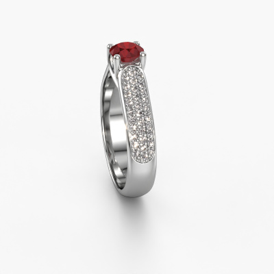The ring shown above is called the Leoness. We call this type of ring a pavé solitaire ring. The center gemstone is surrounded by smaller sized stones. This platinum version is set with a 5 mm round ruby center stone, embraced by smaller diamonds. What makes this classic platinum pavé solitaire ring special is the setting of the smaller gems surrounding the center ruby, which are shaped like a beautiful flower. The surrounding pavé solitaire of stones frame the middle center stone in such a way to make it appear bigger. This type of engagement ring is also called a flower ring. It is very important that the smaller diamonds are positioned identically so there is no interference of light but perfect unity instead. Our skilled Goldsmiths get the job done. Each individual stone is carefully set by hand. During manufacturing, light fall is constantly monitored to make sure the special pavé solitaire effect is still visible. In the end you get the perfect engagement ring with a radiant ruby gemstone centerpiece. You can imagine the effect of a ring of such significance when you give tot the love of your life on her special day to shine. This jewel is unique in every way! Simply customize to your liking,By using our modern techniques, we can design and customize the finest quality jewels with the utmost care for you. Our engagement rings are always priced 30 percent lower than other jewelers. We make engagement rings to order so we don't have to maintain a large stock. If you have a certain budget, we are more than happy to advice you accordingly.Have you found a specific engagement ring somewhere which you would like to give to your loved one? Please feel free to express your wishes to our jewel designers because we would be honored to turn your design into a classic engagement ring. You can follow the development of your ring design because we use 3D drawings. This gives you a realistic preview of how your design will look. You can also preorder a dummy. A dummy is a plastic ring, which can be shaped according your ring design. You can try it on and check if its width and size are suitable for you. We will gladly send you a non-binding offer, based on a fair price/ quality ratio. It will amaze you, considering the quality of the ring and gemstones.To make it easier for you, we offer a 30 day return policy. Check our terms and conditions.