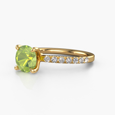 The ring shown above is called the Crystal RND 2. We call this type of ring a pavé solitaire ring because it has one center gemstone and a band that is also pave set with gemstones. The 14 Carat gold engagement ring is set with a round 7.3 mm peridot center stone and the band is pave set with lab-grown diamond gemstones. Each jewel is unique in every way! Simply customize to your liking,This classic gold pavé solitaire engagement ring has an exquisite round peridot center stone. To further accentuate the center stone, the band is fully set with more lab grown diamonds. Its open prong setting allows light to strike the peridot from various angles and this adds sparkle to your peridot ring. The photo shown above depicts the goldsmith's carefully handcrafted details of the ring. The high positioning of the center stone is truly eye-catching. The perfect engagement ring for the crown jewel of your life! After receiving your order, our goldsmiths will start the creative process of making your Crystal RND 2 engagement ring. We don't keep stock. This is advantageous because these costs will not be passed on to you. Therefore, we can offer jewelry at exceptionally low prices.Different styles of new rings are made daily by our team. Perhaps you have found a pavé solitaire engagement ring somewhere. One you would like to give to your loved one. Please feel free to share your thoughts and design with our jewel designers. We would love to turn your design into a classic engagement ring. You can follow the development of your ring design because we use very detailed 3D drawings. On top of that, you can order a dummy of the design. A dummy is a plastic ring, which can be shaped according your ring design. You can try it on and check if the engagement ring is up to standard. We will gladly send you a non-binding offer, based on a fair price/ quality ratio. The offer will baffle you, considering the quality of the ring and gemstones.To make it easier for you, we offer a 30 day return policy. Check our terms and conditions.