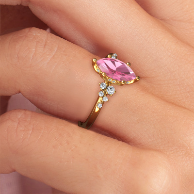 This 14 Carat gold ring is called Emma MRQ and is set with pink sapphire. How would you describe the style of the love of your life? Does she have a unique sense of style? This stunning special gold engagement ring can be custom made to your own or her liking. Our pink sapphire gemstones have been carefully selected because we believe your trendy engagement ring must be adorned with nothing but the most beautiful gemstone. Don't you agree? This jewel is made just for you, with attention to detail and design.After receiving your order, our goldsmiths will passionately start the creative process of making your engagement ring in our own studio. Because we don't have a big stockpile, these costs will not be passed on to you. Our pricing is proof of that! We offer top quality jewels at lowest price, guaranteed.Do you have a specific ring in mind? One you came across somewhere. Please feel free to tell us your wishes and we will turn your design into a unique engagement ring. You can follow the development of your ring design because we use 3D drawings. This gives you a realistic preview of your design. We will gladly send you a non-binding offer, based on a fair price/ quality ratio. It will amaze you.To make it easier for you, we offer a 30 day return policy. Check our terms and conditions.