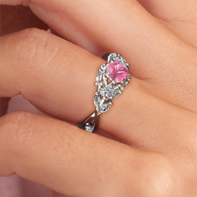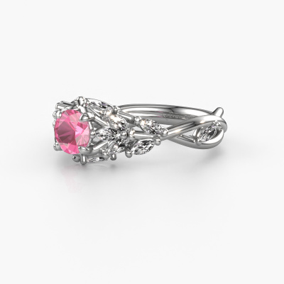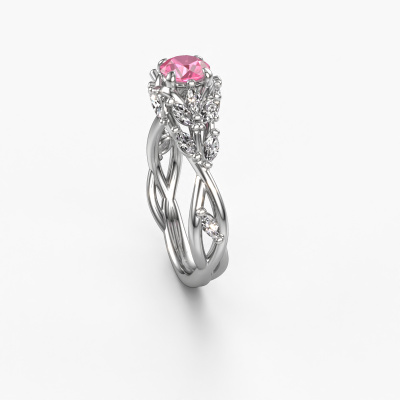 The ring shown above is called the Samantha RND. We call this type of ring a pavé solitaire ring because it has one center gemstone and a band that is also pave set with gemstones. This engagement ring is made in 14 Carat white gold set with a 5 mm round pink sapphire, and pave set diamonds at the sides. Each piece of jewelry is made with passion and love by one of our master goldsmiths.This contemporary white gold pavé solitaire engagement ring has an exquisite round pink sapphire center stone. To further accentuate the center stone, the band is set full with more diamonds. Its open prong setting allows light to strike the pink sapphire from various angles and this adds sparkle to your pink sapphire ring. The photo shown above depicts the goldsmith's carefully handcrafted details of the ring. The high positioning of the center stone is truly eye-catching. The perfect engagement ring for the crown jewel of your life!By using a combination of the latest modern techniques, combined with ancient crafting, we can make all our engagement rings in our own studio. Each jewel is made to order. This is advantageous because we can offer you a price you won't find anywhere else.Our designers and goldsmiths work together each day, creating new jewels. Perhaps you have found a nice contemporary engagement ring somewhere, which can be used to customize your unique ring. Please feel free to contact us. We will make you an offer, based on a fair price/ quality ratio, which will amaze you.To make it easier for you, we offer a 30 day return policy. Check our terms and conditions.