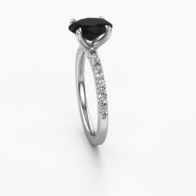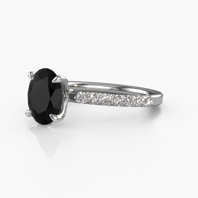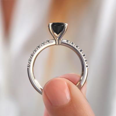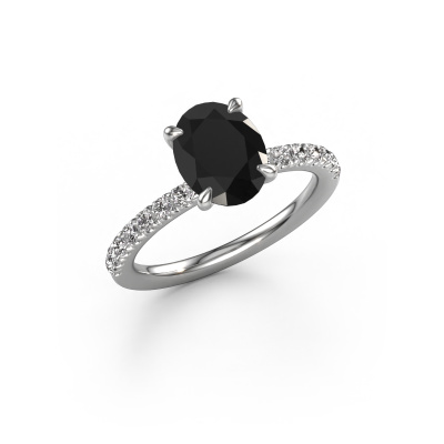 The ring shown above is called the Crystal OVL 2. We call this type of ring a pavé solitaire ring because it has one center gemstone and a band that is also pave set with gemstones. The platinum engagement ring is set with a oval 2.16 crt black diamond center stone and the band is pave set with lab-grown diamond gemstones. Each jewel is made just for you by our master goldsmiths in our own studio.This exclusive platinum pavé solitaire engagement ring has an exquisite oval black diamond center stone. To further accentuate the center stone, the band is fully set with more lab grown diamonds. Its open prong setting allows light to strike the black diamond from various angles and this adds sparkle to your black diamond ring. The photo shown above depicts the goldsmith's carefully handcrafted details of the ring. The high positioning of the center stone is truly eye-catching. The perfect engagement ring for the crown jewel of your life! By using a combination of the latest modern techniques, combined with ancient crafting, we can make all our engagement rings in our own studio. Each jewel is made to order. This is advantageous because we can offer you a price you won't find anywhere else.Our team adds new designs to our online collection daily. Our designers and goldsmiths work together in creating the best design. We strive to offer a diverse collection of jewels. Perhaps you have a specific jewel design in mind. One you came across somewhere. Please contact us for a free consultation. We will make you an offer, based on a fair price/ quality ratio, that will baffle you.To make it easier for you, we offer a 30 day return policy. Check our terms and conditions.