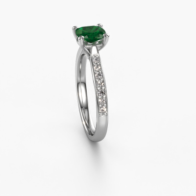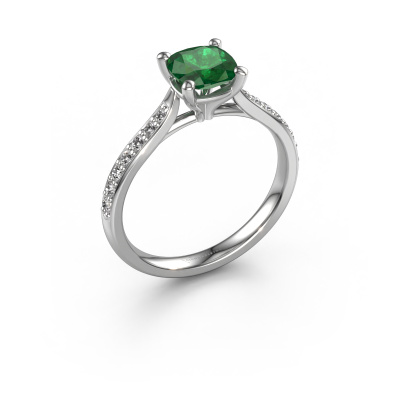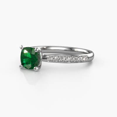 The ring shown above is called the Mignon cus 2. We call this type of ring a pavé solitaire ring because it has one center gemstone and a band that is also pave set with gemstones. The platinum engagement ring is set with a cushion 6 mm emerald center stone and the band is pave set with lab-grown diamond gemstones. Each jewel is made with passion and love by one of our master goldsmiths.This exclusive platinum pavé solitaire engagement ring has an exquisite cushion emerald center stone. To further accentuate the center stone, the band is fully set with more lab grown diamonds. Its open prong setting allows light to strike the emerald from various angles and this adds sparkle to your emerald ring. The photo shown above depicts the goldsmith's carefully handcrafted details of the ring. The high positioning of the center stone is truly eye-catching. The perfect engagement ring for the crown jewel of your life! After receiving your order, our goldsmiths will start the creative process of making your Mignon cus 2 engagement ring. We don't keep stock. This is advantageous because these costs will not be passed on to you. Therefore, we can offer jewelry at exceptionally low prices.Our team adds new designs to our online collection daily. Our designers and goldsmiths work together in creating the best design. We strive to offer a diverse collection of jewels. Perhaps you have a specific jewel design in mind. One you came across somewhere. Please contact us for a free consultation. We will make you an offer, based on a fair price/ quality ratio, that will baffle you.To make it easier for you, we offer a 30 day return policy. Check our terms and conditions.